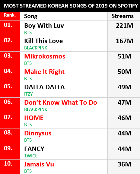 K Charts And Stats On Twitter Most Streamed Korean Songs Of 2019 On Spotify Https T Co Iebhuiv38x Twitter