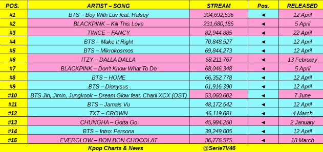 Kpop On Charts On Twitter Top 30 Most Streamed Kpop Songs On Spotify Released In 2019 Bts Blackpink Twice Itzy Chungha Everglow Straykids Somi G I Dle Hwasa Mamamoo Redvelvet Kard